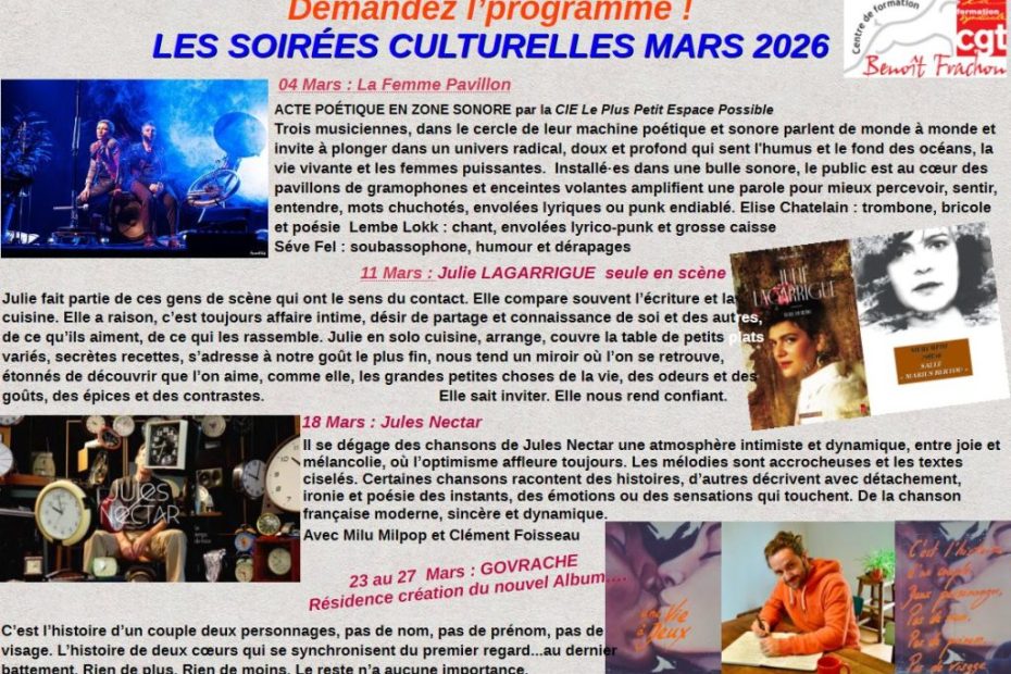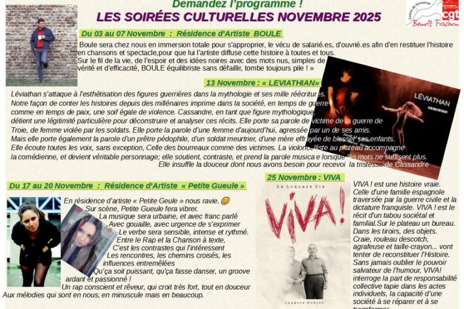 Découvrez l’actualité mensuelle culturelle du centre Benoit Frachon qui se passe dans notre belle salle « Marius Bertou » – au Coinviviale – en extérieur.